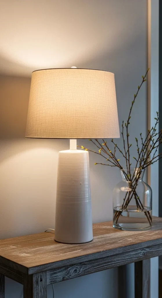 A ceramic lamp introduces shape, texture, and warmth in one piece. Look for bases with gentle curves or light ribbing. White, cream, or pale gray work with nearly any palette. A linen shade softens the glow and avoids harsh brightness. Place one on a console, nightstand, or side table. Lamps create layers of light that overhead fixtures can’t match. Check secondhand shops for quality ceramic bases. Swap out the shade for something lighter if needed. Use warm LED bulbs for a cozy tone. Subtle texture adds visual interest without clutter. Keep cords hidden with adhesive clips for a cleaner look. Pair with a small stack of books or a decorative tray.