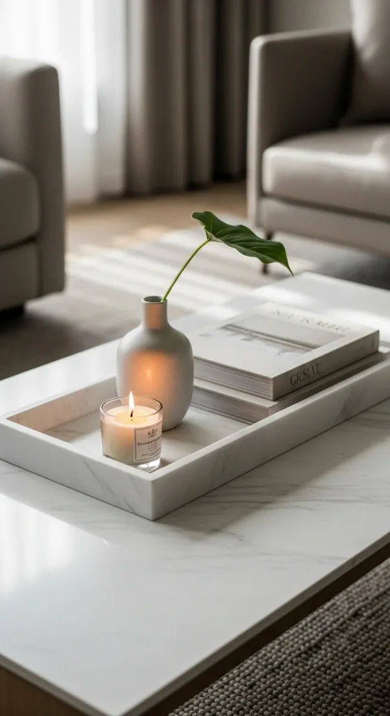 Marble trays bring polish to everyday surfaces. They instantly make small groupings look intentional. Use one on a coffee table, dresser, or bathroom vanity. Real marble feels substantial, but faux versions can look just as good. Keep styling simple. Three items usually feel balanced. A candle, small vase, and book create a pleasing trio. Choose items with varied heights. Wipe the tray regularly to keep it looking crisp. If marble feels too cool, layer in warmth with wood or ceramic accessories. Clean-lined surfaces keep rooms from feeling busy. Trays also corral clutter, making spaces easier to maintain.