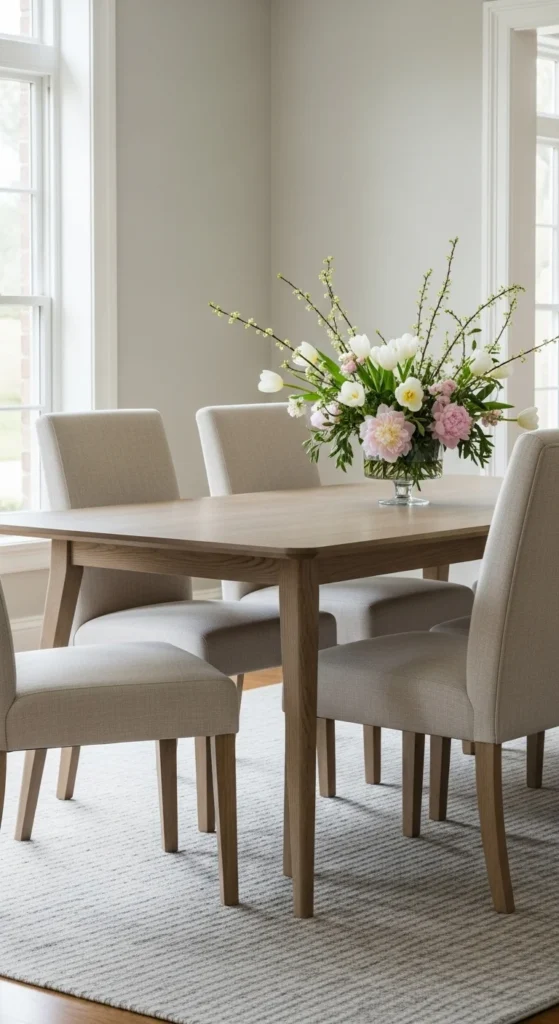 Fabric dining chairs add softness where hard surfaces dominate. Choose neutral upholstery for longevity. Linen, performance fabric, or textured weaves work well. Light colors brighten the room and suit spring styling. If replacing chairs isn’t an option, consider slipcovers. They’re affordable and washable. Add thin seat cushions for extra comfort. Keep legs simple for a timeless look. Wood or black finishes pair easily with most tables. Comfort-driven seating encourages longer meals and conversation. Vacuum upholstery regularly to prevent dust buildup. Spot clean spills quickly to avoid stains.