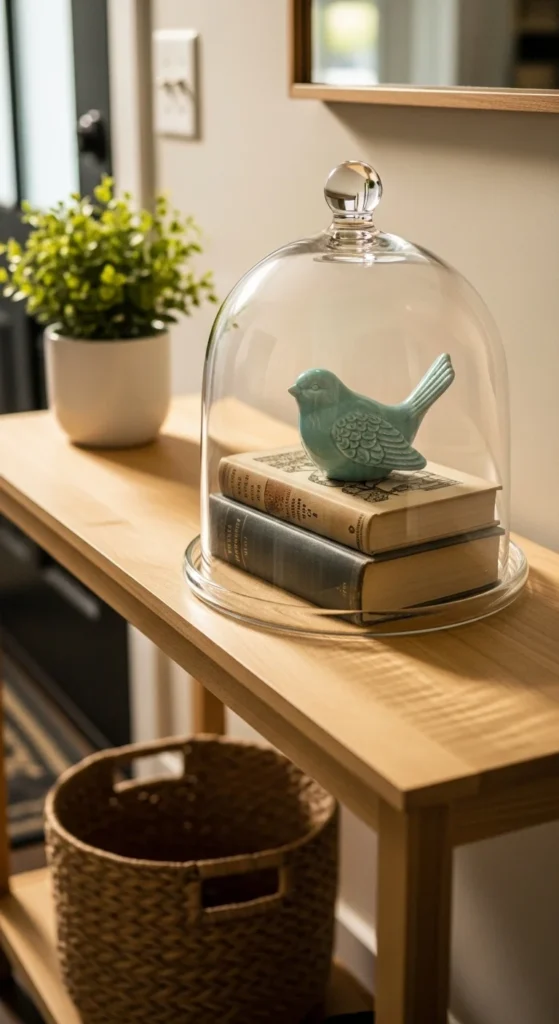 A glass cloche turns ordinary objects into decor. Stack two or three books. Add a small sculpture, candle, or dried florals. The dome creates a focal point without clutter. Cloche displays look great on sideboards, shelves, or nightstands. Thrift stores often carry them at low prices. Change what’s inside seasonally. Keep colors cohesive for a calm look. Simple enclosed styling feels intentional and tidy. Avoid overfilling the space. Let negative space do some of the work.