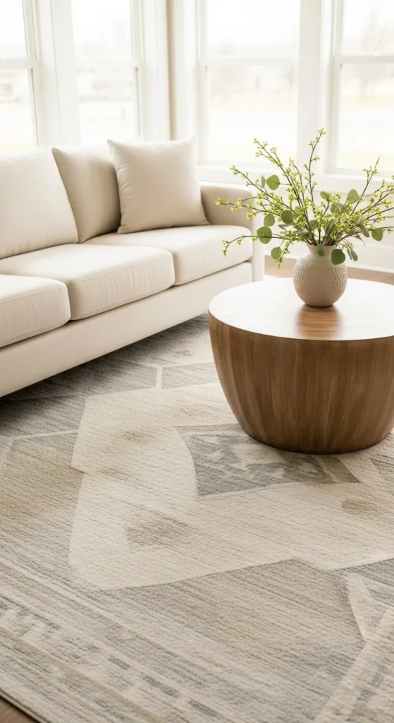 A patterned rug anchors furniture and adds warmth. Look for low-contrast designs in beige, gray, or taupe. Subtle pattern hides wear better than solid colors. Choose a size that allows front furniture legs to rest on the rug. This makes the room feel more connected. Washable rugs are great for busy homes. Layer a small accent rug over a larger jute base for depth. Grounded foundations make styling easier across seasons. Vacuum regularly and rotate every few months.
