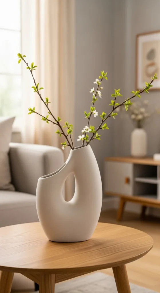Sculptural vases act as decor even when empty. Choose organic shapes with gentle curves. Matte finishes feel soft and refined. Fill with budding branches, eucalyptus, or simple stems. Keep arrangements loose. Overstuffed vases feel heavy. Group with one or two smaller objects for balance. Organic silhouettes soften straight-lined furniture. Ceramic pieces from local artisans add character. Check flea markets for unique finds.