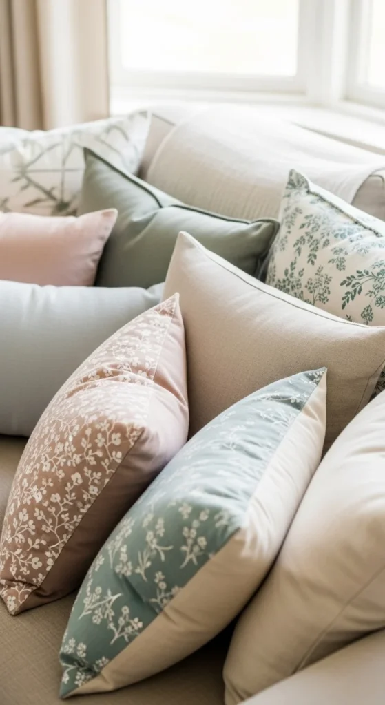 Pillows are one of the easiest seasonal swaps. Start with two neutral bases. Add one patterned pillow and one soft pastel. Mix textures like linen, cotton, and light knit. Keep color palette limited to avoid chaos. Down or down-alternative inserts look fuller than foam. Chop the top lightly for a relaxed look. Textural contrast creates depth without clutter. Store off-season covers in breathable bags.