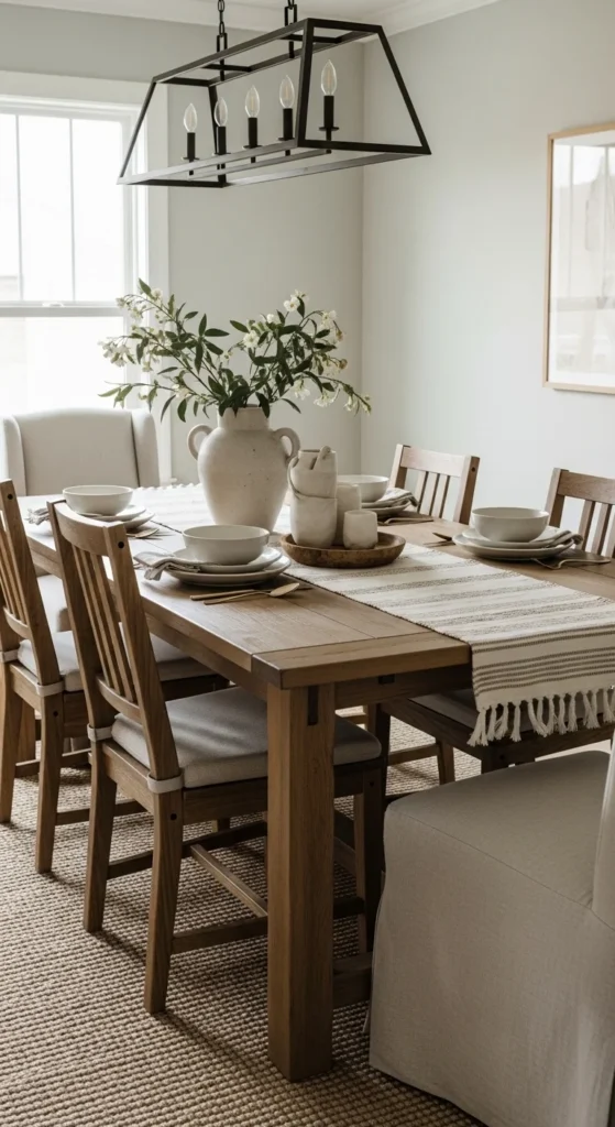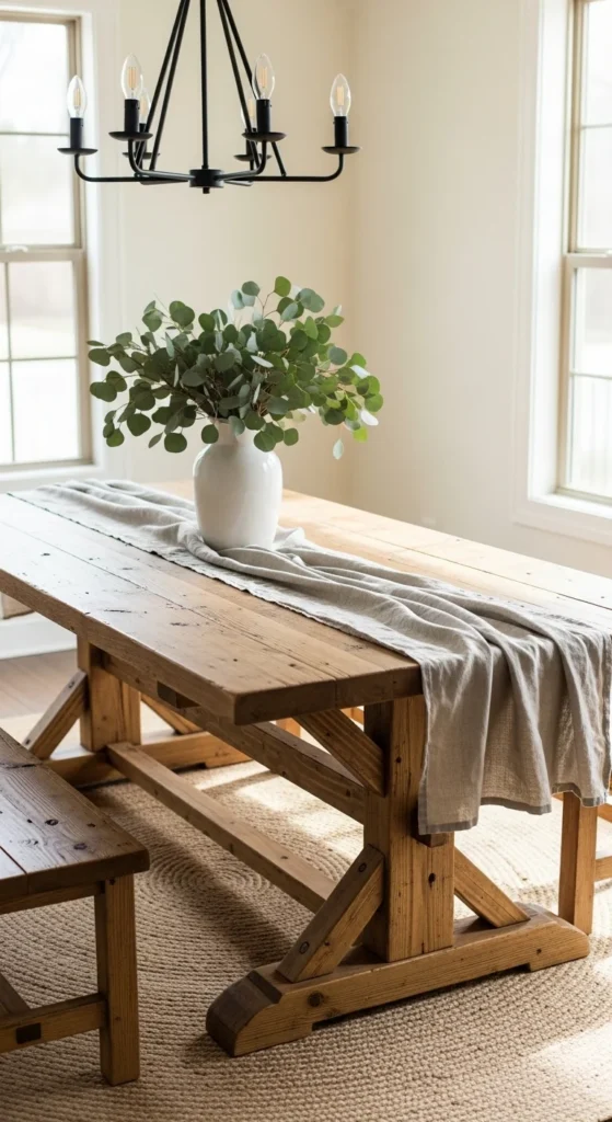 A reclaimed wood table sets the whole mood. Go for visible grain, knots, and a slightly matte finish. It reads warm and welcoming. Keep the silhouette clean so it feels modern farmhouse, not themed. If the table is new wood, fake age with a light sand on edges and a walnut stain wash. Seal with a satin topcoat so spills wipe fast. For budget, check resale apps for solid-wood pieces with scratches you can embrace. Pair it with simple chairs so the table stays the star. Style the surface with a runner, one vase, and two candleholders. That’s it. Too many objects make the table feel like a shelf. Add black metal accents through lighting or hardware for contrast. If your room is small, choose a narrower table and skip bulky end chairs. A bench slides in neatly and keeps walkways clear. Finish with a low-pile rug so chairs move smoothly.