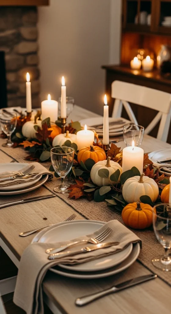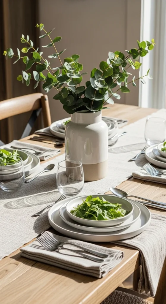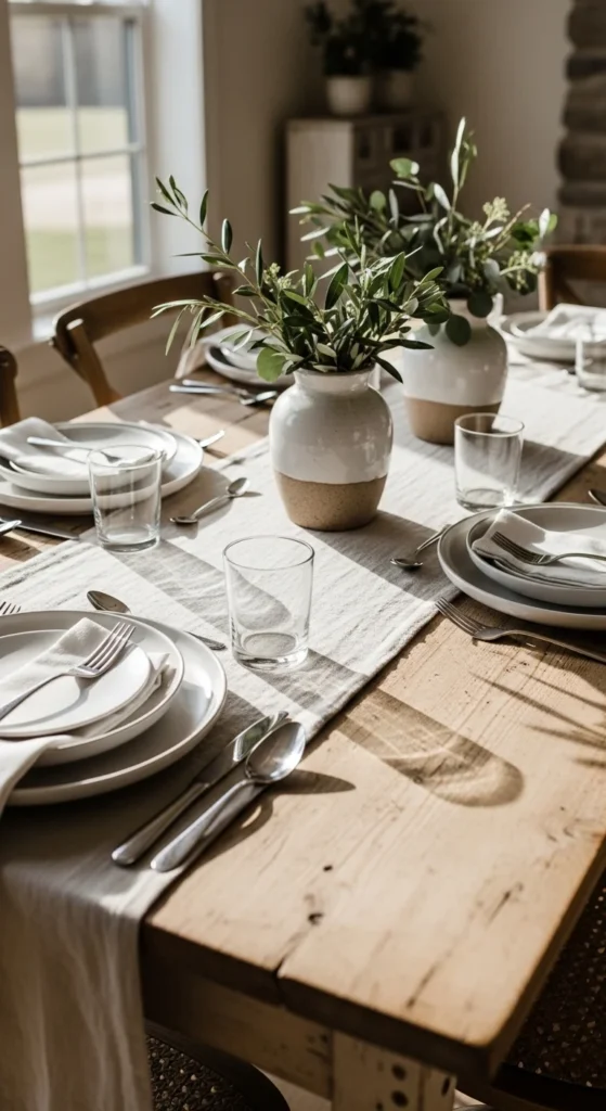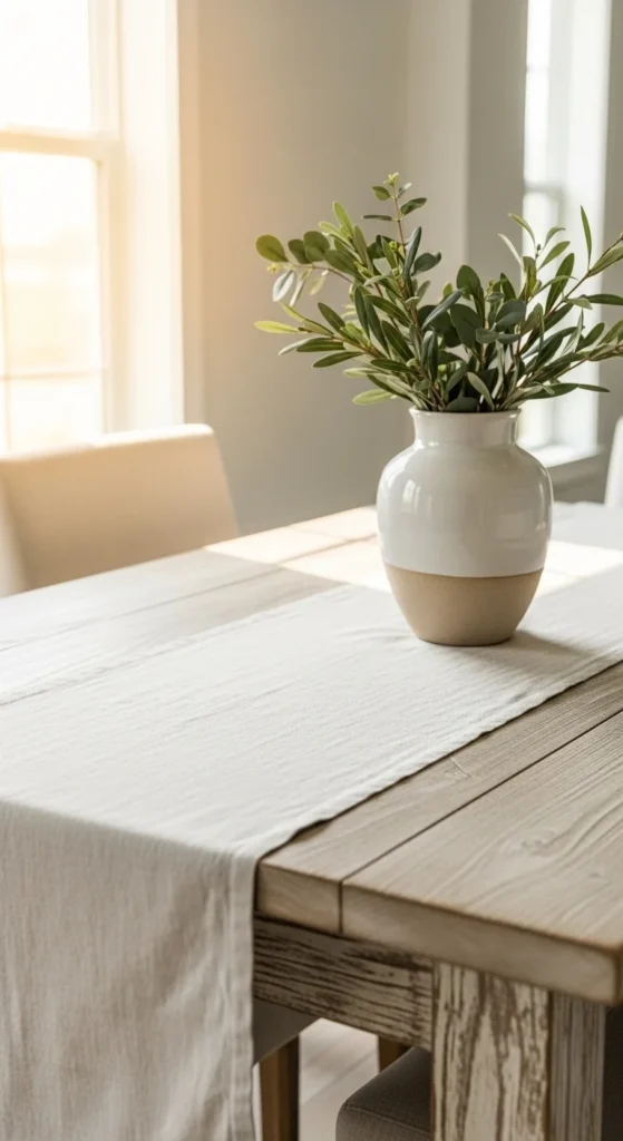 Table styling looks best when it’s simple. Start with a linen runner in oatmeal, flax, or soft gray. Linen adds texture without a loud pattern. Then pick one centerpiece that has presence: a ceramic vase with greenery, a wooden dough bowl with seasonal stems, or a low tray with candles. Keep the height practical so people can talk across the table. If your centerpiece is tall, keep it narrow. If it’s wide, keep it low. You can change the stems seasonally without buying new everything: olive branches for everyday, dried grasses for fall, pine for winter. For budget, use grocery-store eucalyptus and a thrifted crock vase. Add set-and-forget styling with two simple candleholders and stop there. When the table is easy to clear, you’ll actually use it. That’s what makes the room feel welcoming, not staged.