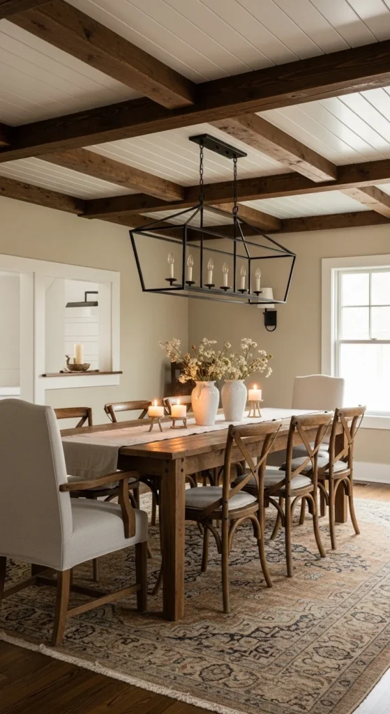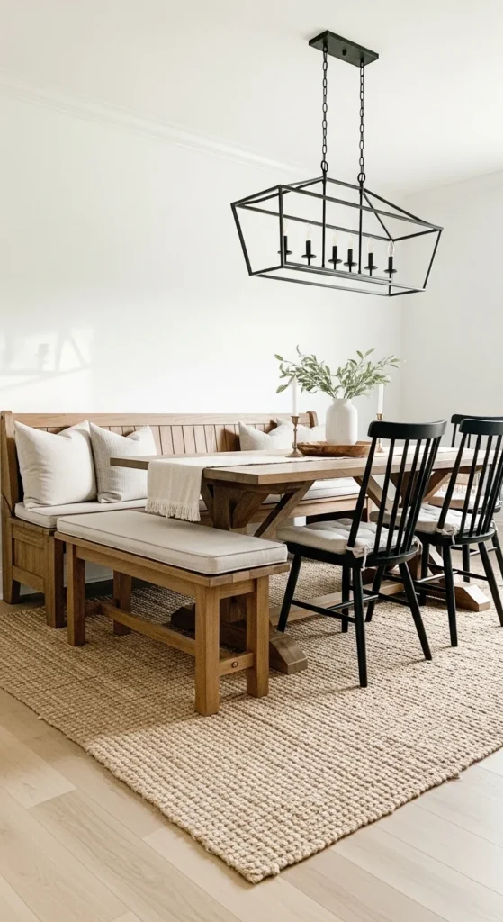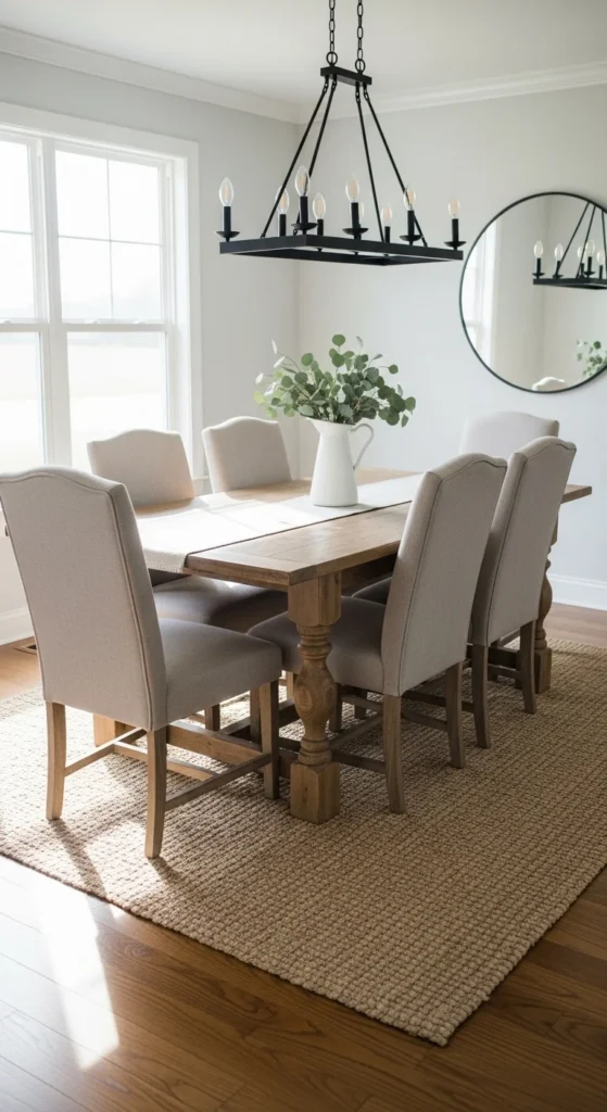 A rug helps define the dining zone, especially in open layouts. Jute, sisal, or flatweave rugs work best because chairs slide easily. Choose a size that extends at least 24 inches beyond the table on all sides so chairs stay on the rug when pulled out. Stick to natural tones or subtle patterns. Busy designs compete with wood grain and feel heavy. For budget spaces, layer a smaller patterned flatweave over a larger neutral rug. It adds depth without extra cost. If spills worry you, look for washable flatweave rugs or outdoor rugs designed to look like indoor styles. A rug adds warmth underfoot and softens sound. It makes the room feel finished without crowding it. Simple rugs work hardest in farmhouse dining rooms.