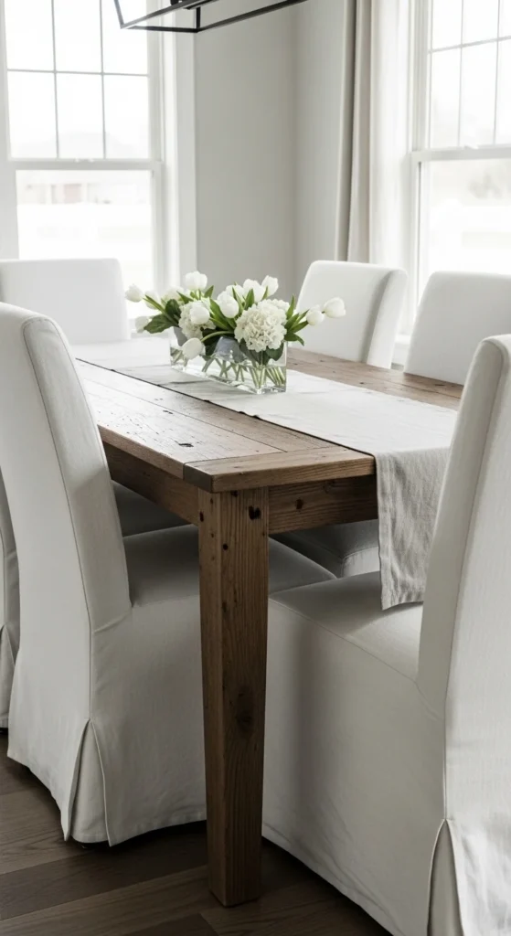 Slipcovered chairs bring softness to wood-heavy spaces. White, cream, or oatmeal covers look timeless. Choose washable fabrics so everyday messes aren’t stressful. If you already have chairs, buy universal slipcovers or sew simple drop covers using cotton duck or linen-blend fabric. Keep the fit slightly relaxed, not skin-tight. That casual drape feels farmhouse-friendly. Pair slipcovered chairs with a wood bench or painted chairs to avoid an overly uniform look. Slipcovers also let you change color seasonally without replacing furniture. They’re great for families and pets. Soft seating balances rough textures like reclaimed wood and metal.