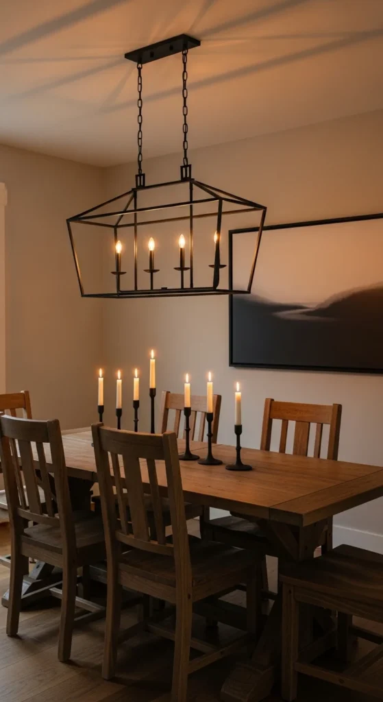 A statement chandelier is the fastest way to make the dining zone feel intentional. Choose a size that won’t look timid over the table and aim for a fixture that spans roughly two-thirds of the tabletop width. Hang it about 30–34 inches above the table so faces stay visible and the light feels intimate. Use warm bulbs around 2700K for a cozy glow that flatters wood tones. If you’re renting or wiring is a hassle, convert a plug-in pendant with a ceiling hook and a cord cover. For a low-cost upgrade, repaint an outdated brass fixture in matte black or aged bronze, then swap in candle-style LED bulbs. Keep the rest of the decor simple so the chandelier reads like a focal piece. A long runner and a single centerpiece are plenty. Add warm lighting in layers with a nearby lamp or sconce so the room feels comfortable after sunset.