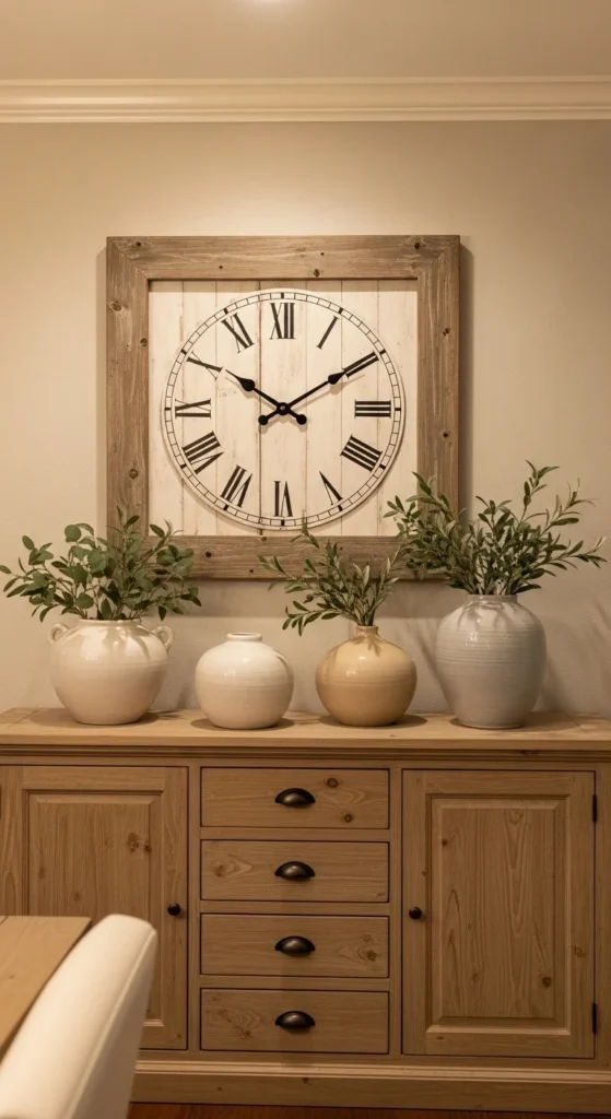 A vintage-style wall clock adds function and character. Choose a simple face with muted tones and minimal markings. Oversized clocks work best so they don’t look lost on a dining wall. Place it above a sideboard, bench, or narrow console. Keep surrounding decor minimal so the clock stands out. If you find an old clock at a thrift store, remove the outdated mechanism and install a new quartz movement. It’s inexpensive and easy. Wood, metal, or mixed-material frames all work well. Avoid overly ornate designs. A clock brings subtle charm without feeling themed. One statement wall piece is often better than several small ones.
