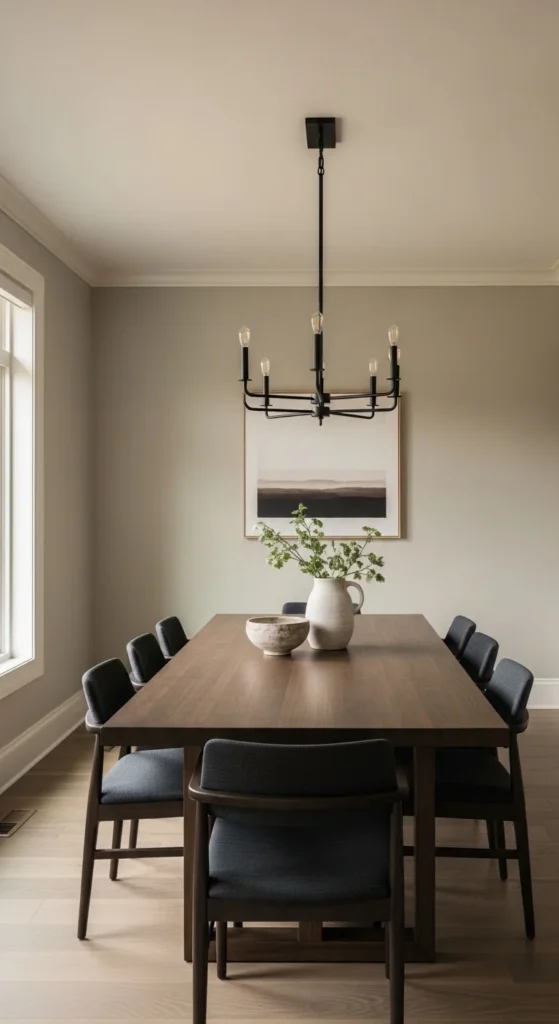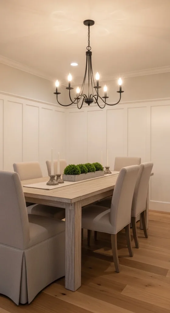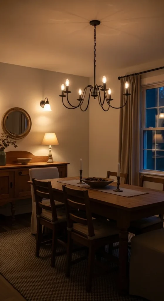 One ceiling light isn’t enough. Layer lighting for comfort. Start with the chandelier. Add wall sconces or a lamp on a sideboard. Use warm bulbs across all fixtures. Keep light levels gentle. Dimmers are helpful but not required. Even table lamps on low wattage bulbs can change the mood. Soft lighting makes dinners feel relaxed and welcoming. It also highlights textures in wood and fabric. You don’t need fancy fixtures. Simple lights placed well make the biggest difference. Multiple light sources create warmth.