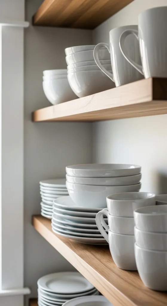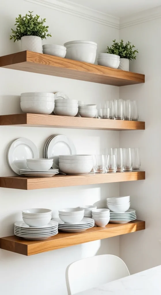 Open shelves turn everyday dishes into decor. Use sturdy wood shelves with simple brackets or hidden supports. Stick to a tight color palette white, cream, and soft gray photographs beautifully. Group items in small clusters and leave space between them. Too much on every shelf looks messy fast. Mix plates, bowls, and a few decorative pieces like small plants or vases. Rotate items seasonally instead of adding more. For budget, use shelves from big-box stores and upgrade the brackets to black metal for contrast. Open shelving works especially well near a dining nook or sideboard. It adds interest without overwhelming the room. The key is restraint. Less on shelves looks better than more.