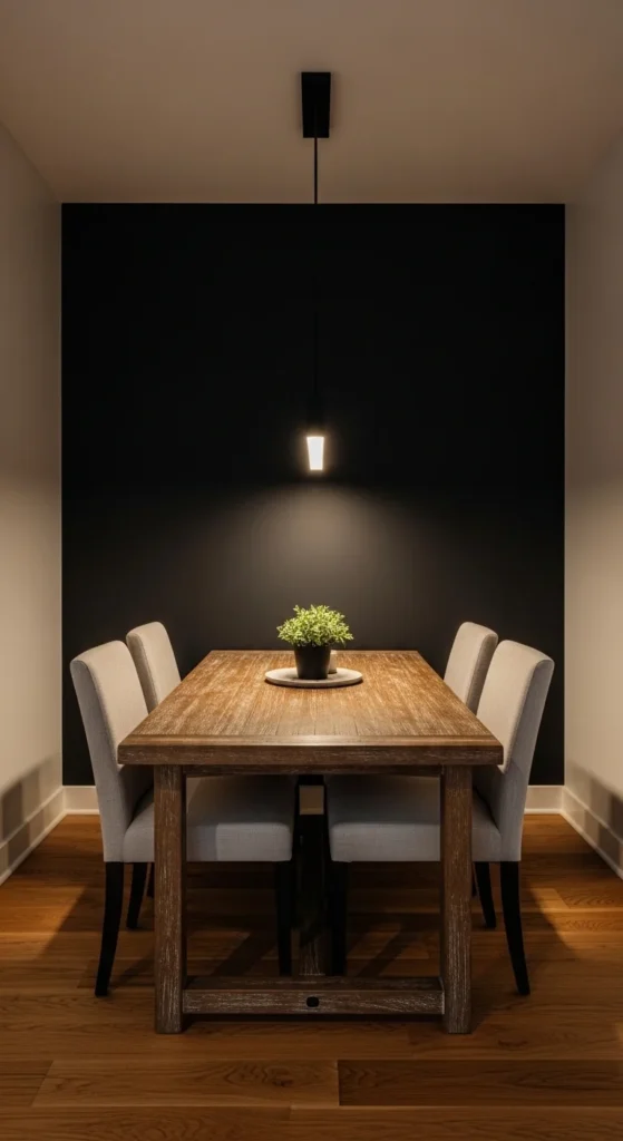 A dark accent wall adds depth without overwhelming the room. Charcoal, deep green, or navy work well. Use it on the wall behind a sideboard or bench. Keep the remaining walls light so the space stays balanced. Dark paint highlights wood grain and white trim beautifully. If painting feels permanent, try peel-and-stick wallpaper in a subtle texture or grasscloth look. Accent walls define the dining area in open layouts. They make the space feel intentional. One dark wall can change everything.