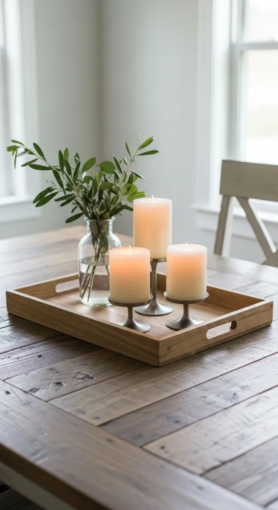 A wooden tray keeps tabletop decor contained. Choose a rectangular or oval tray slightly narrower than the table. Inside, place two candles and one small vase or bowl. That’s enough. Trays make it easy to move decor when you need the table clear. Look for unfinished or lightly stained wood. Avoid glossy finishes. For budget, thrift a tray and sand it lightly. Trays add structure to casual styling. They keep things from feeling scattered. The contained decor looks cleaner.