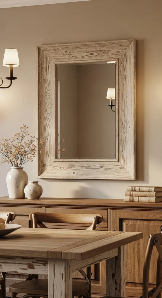 A mirror reflects light and makes dining rooms feel larger. Choose a simple wood or metal frame with a slightly aged finish. Place it above a sideboard or bench. Keep the mirror large enough to feel substantial. Avoid ornate gold frames. For budget, check flea markets and repaint the frame if needed. Mirrors also bounce candlelight beautifully during dinner. They add quiet drama without extra decor. Light reflection adds depth.