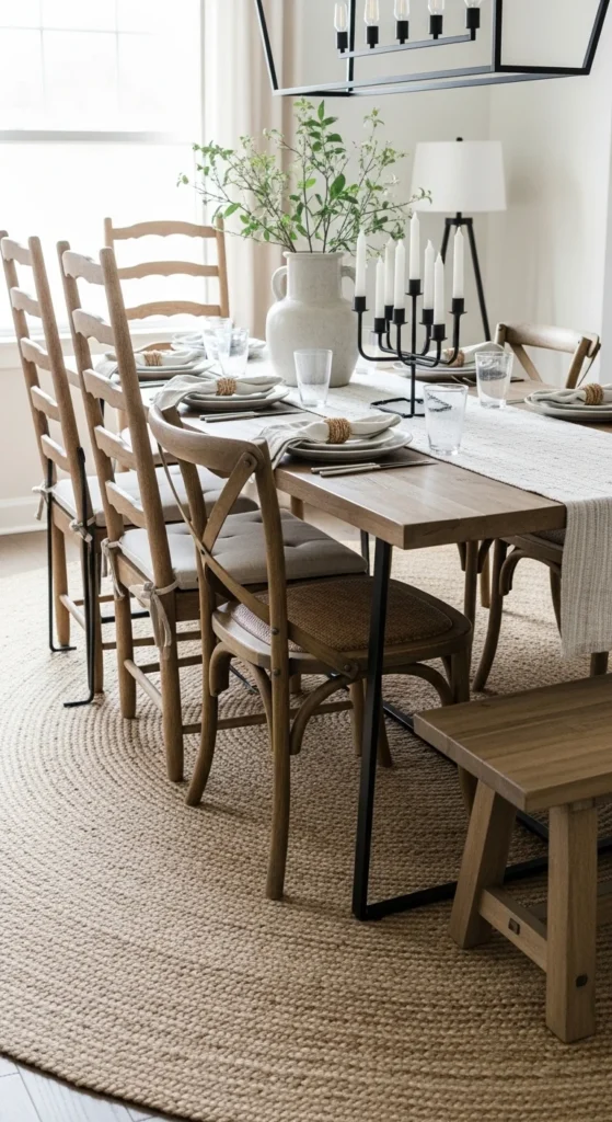 Matching chair sets can feel catalog-stiff. Mixing chairs looks collected and personal. The trick is to repeat one element either the wood tone, the seat color, or the chair shape. Try cross-back chairs on the sides and two ladderbacks at the ends. Or add a bench on one side and keep chairs on the other. If the mix feels chaotic, unify it with cushions in the same fabric or paint two chairs the same color. Thrift stores are perfect for singles; sand, prime, and repaint in warm white or charcoal for an easy refresh. Keep chair heights similar so the table looks balanced. For comfort, add slim seat pads in linen or canvas and tie them underneath. This approach also saves money because you can buy pieces slowly. A seating mix gives you lived-in charm without piling on decor. Let the furniture do the talking.