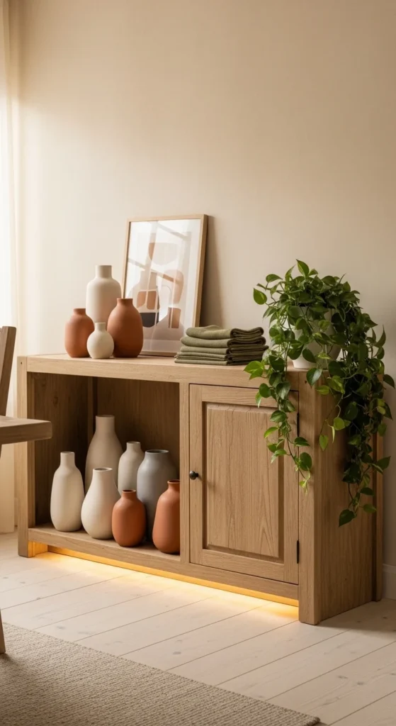A sideboard adds both storage and visual weight. Look for solid wood with simple lines and minimal hardware. Avoid overly ornate details. On top, use a basic formula: one piece of art or mirror, one lamp or vase, and one smaller accent. Inside, the store serving dishes, linens, or seasonal decor. Baskets keep things organized and hidden. If new furniture isn’t in the budget, search secondhand and refinish. A light sanding and new hardware can completely change a piece. Place the sideboard on the longest blank wall so it feels grounded. This piece anchors the room and gives you a place to stage food during gatherings. It’s practical and decorative at the same time.