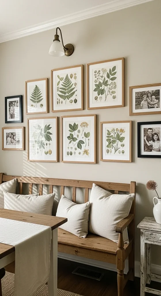 Gallery walls add personality. Choose 6–12 pieces depending on wall size. Keep frames mostly the same color for cohesion. Mix botanicals, landscapes, and a few personal photos. Lay everything out on the floor before hanging. Take a quick photo to remember the layout. Keep spacing consistent, about 2 inches between frames. For budget art, print downloads or use book pages. Thrifted frames painted black or white work well. A gallery wall looks best above a bench, sideboard, or wainscoting. It fills the wall without bulky furniture. Personal touches beat store-bought art every time.