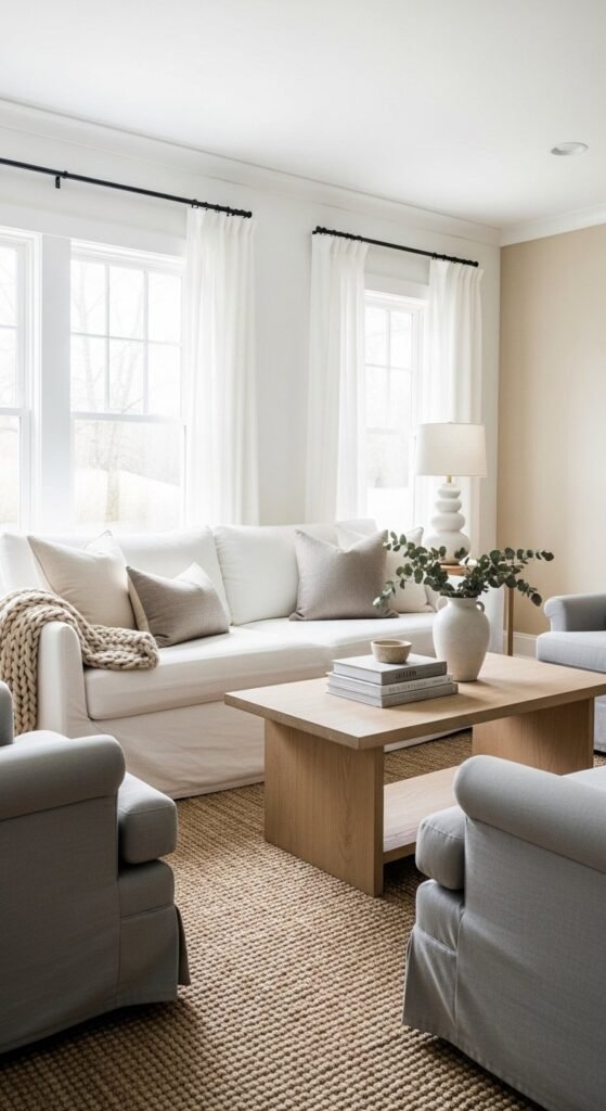 Furniture should follow the same rule. A neutral sofa acts like a blank canvas. Slipcovers help here. They’re washable. They age well. And they feel relaxed instead of stiff. Add contrast later through wood, rugs, and pillows.