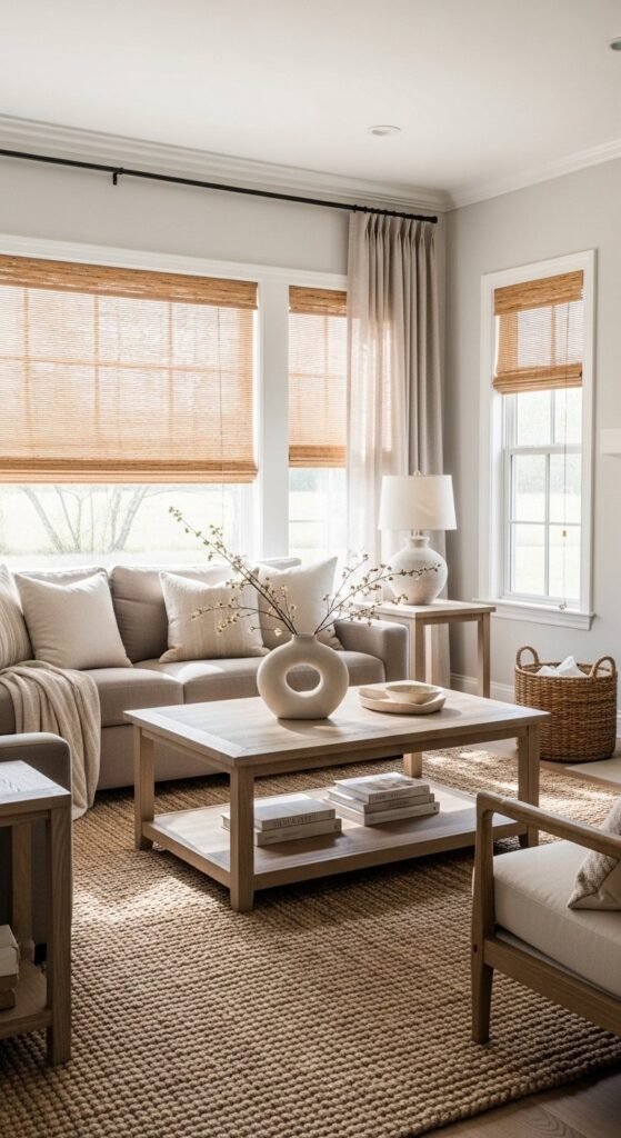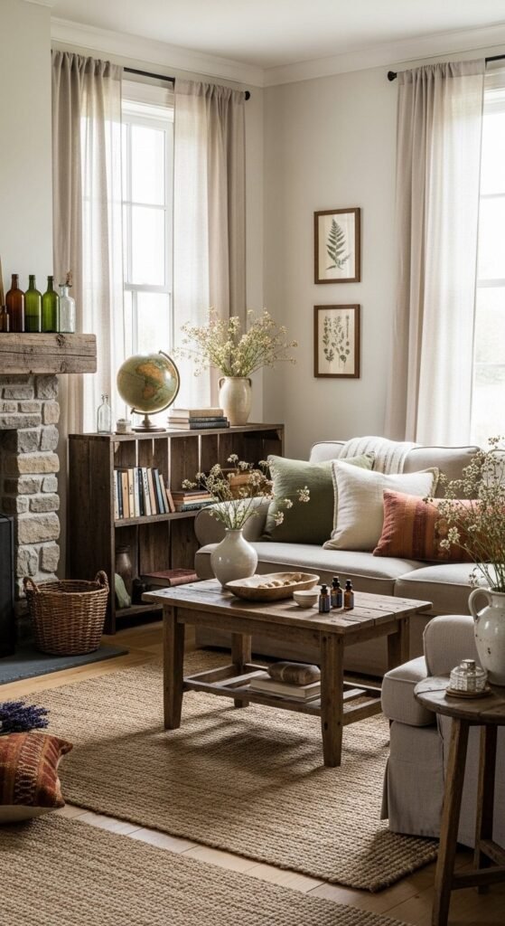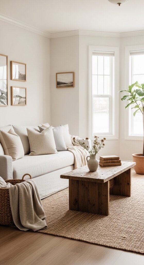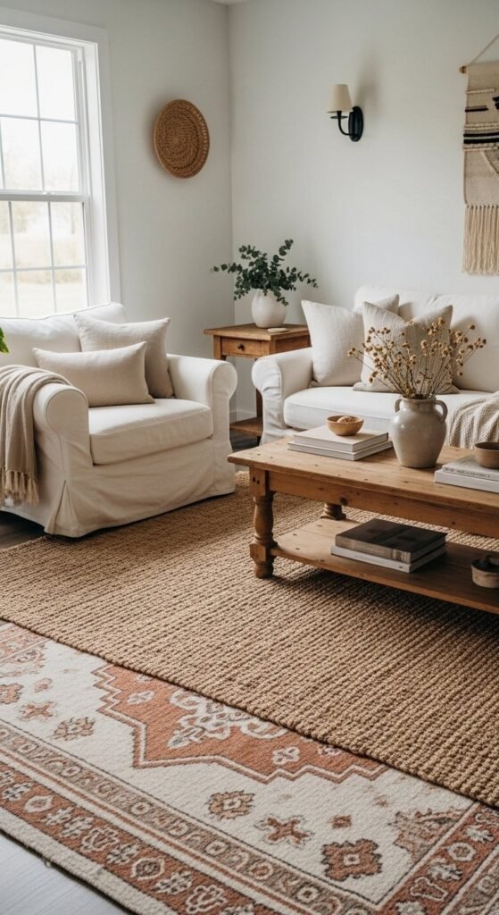 Rugs matter more than people think. A jute rug grounds the room. Layer a smaller wool or kilim rug on top for pattern. This works even in small spaces. Just keep colors muted.