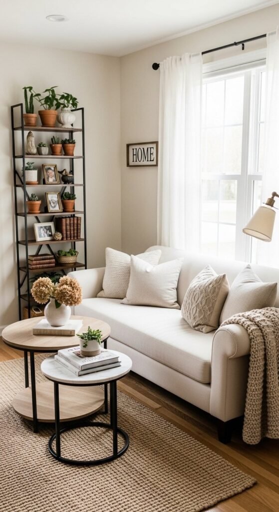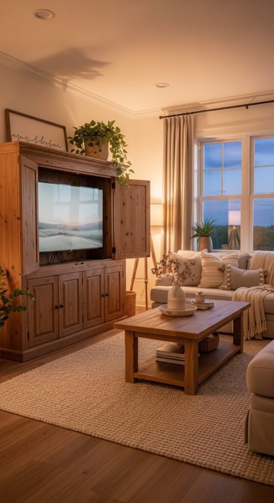 Greenery adds life without clutter. It balances wood and fabric beautifully and keeps the room from feeling too styled. Rotate plants seasonally for subtle change.