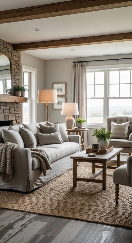 Farmhouse style works well for busy homes when materials are chosen carefully. Slipcovers handle spills and fur with ease. Neutral tones hide wear better than stark white.