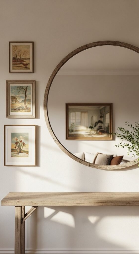 Walls don’t need much. One strong moment beats many small ones. A round mirror reflects light and softens straight lines.