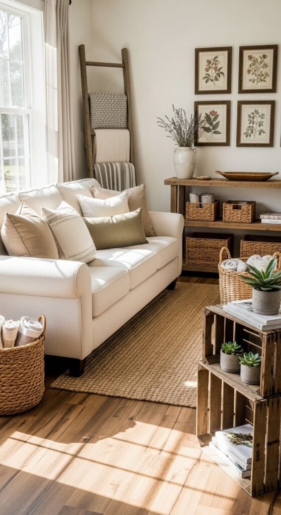 Farmhouse rooms look relaxed because clutter is tucked away. Storage doubles as decor here. Woven baskets slide under tables or benches and hide toys, throws, or magazines.