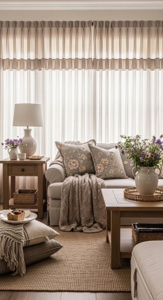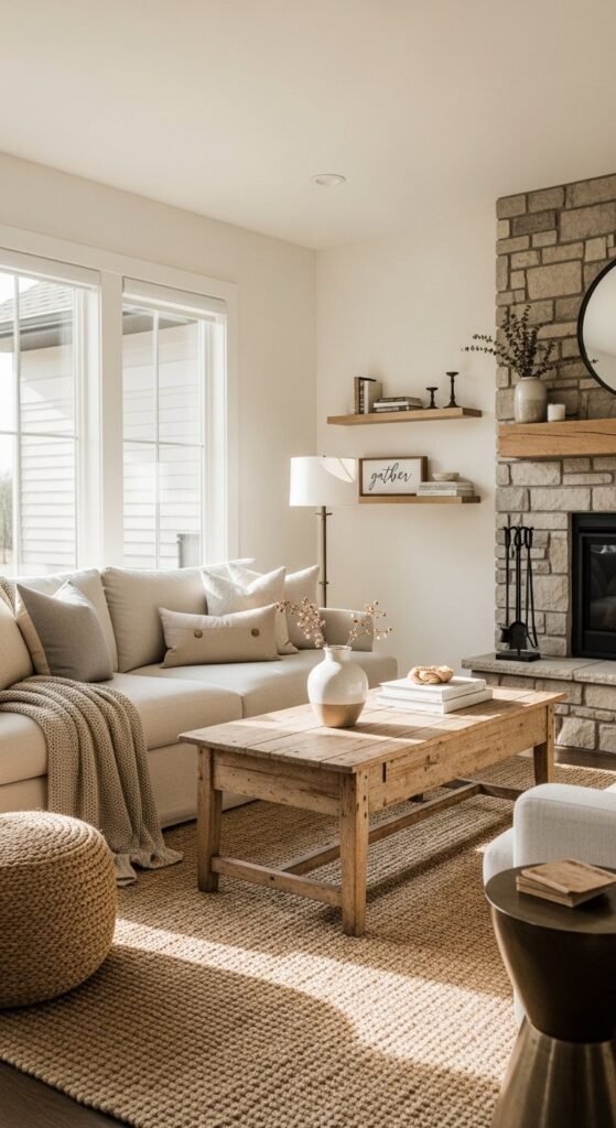 Texture is where farmhouse style comes alive. Without it, the room feels empty. Start with textiles. A linen sofa paired with cotton pillows already creates contrast. Add one chunky knit throw. Not three. One is enough.