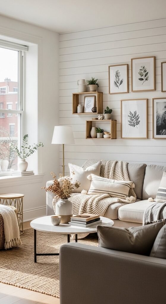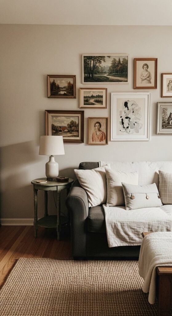 Gallery walls work when colors stay muted. Mix art sizes but keep frames simple. Wood or black metal both fit well.