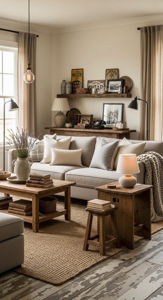 Small spaces still work with farmhouse style. Scale matters more than style here. Choose a slimmer sofa with exposed legs. It feels lighter.
