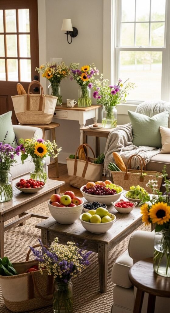 Seasonal styling doesn’t require new decor. Use what you bring home. Bowls of citrus. Fresh flowers. Herbs in small pots.