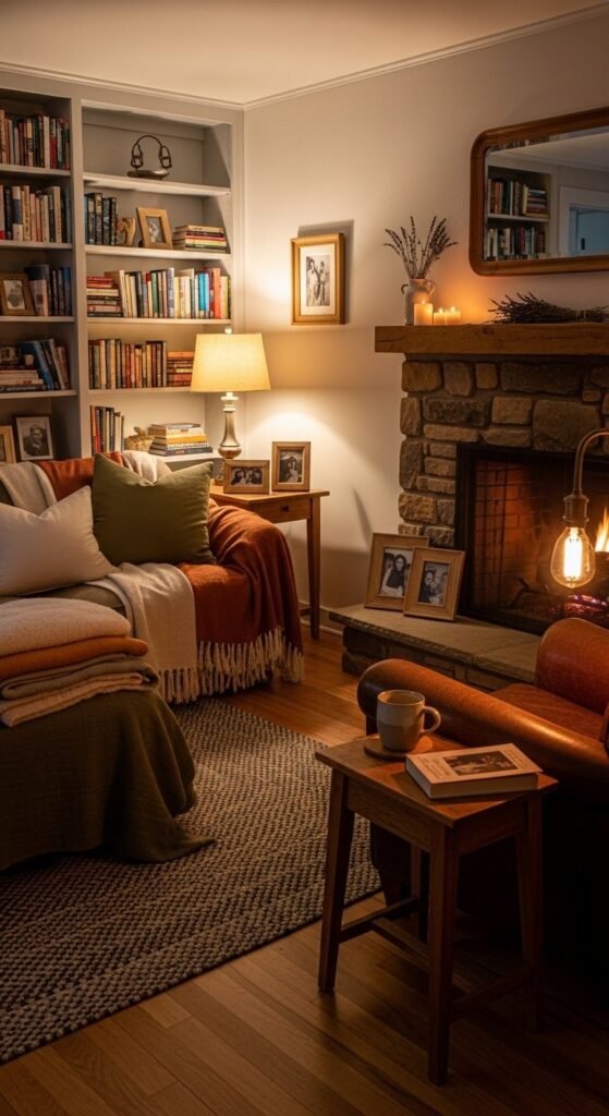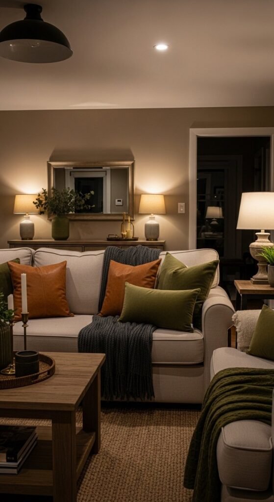 Lighting matters most at night. Table lamps and floor lamps create calm pockets of light.