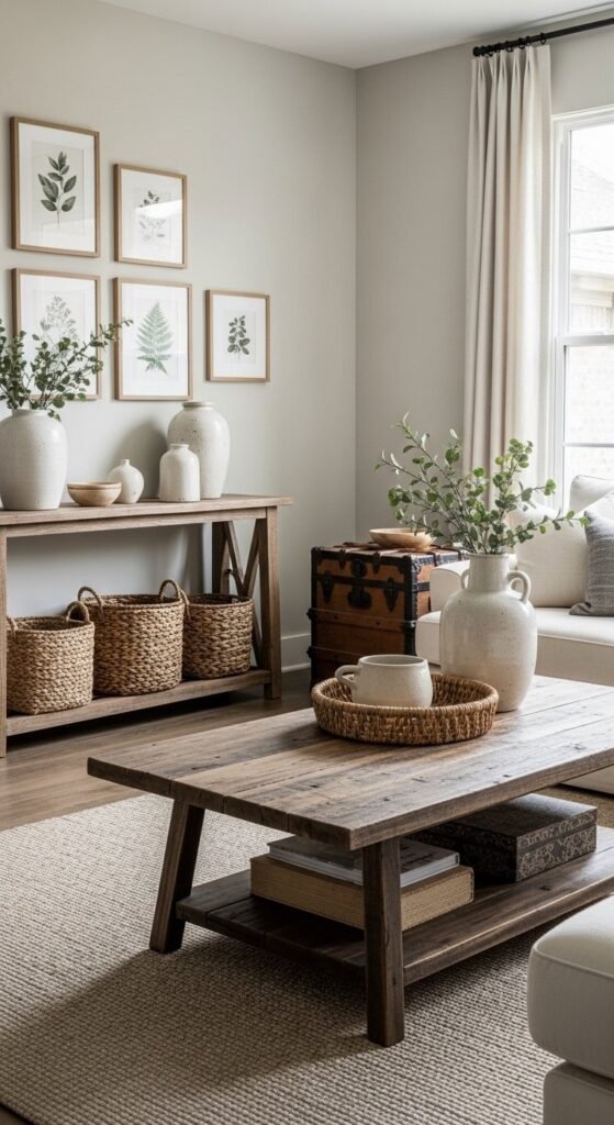 You don’t need exposed beams to bring wood into a farmhouse living room. Small moves work. A reclaimed coffee table. A wood bench under a window. An old trunk used as storage.