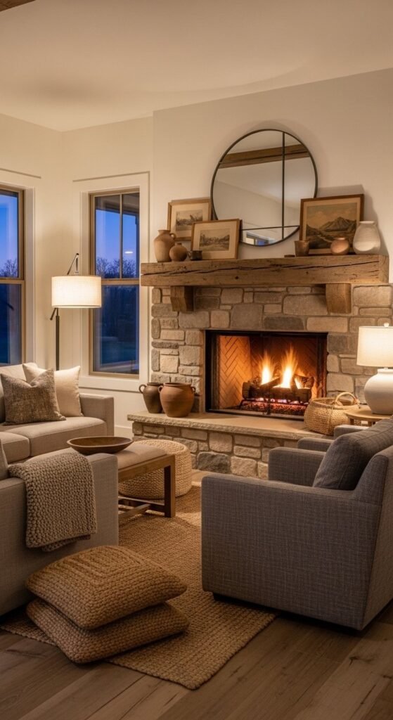 Seating should face the hearth when possible. It makes the room feel social and grounded. A bench near the fireplace adds extra seating without bulk.