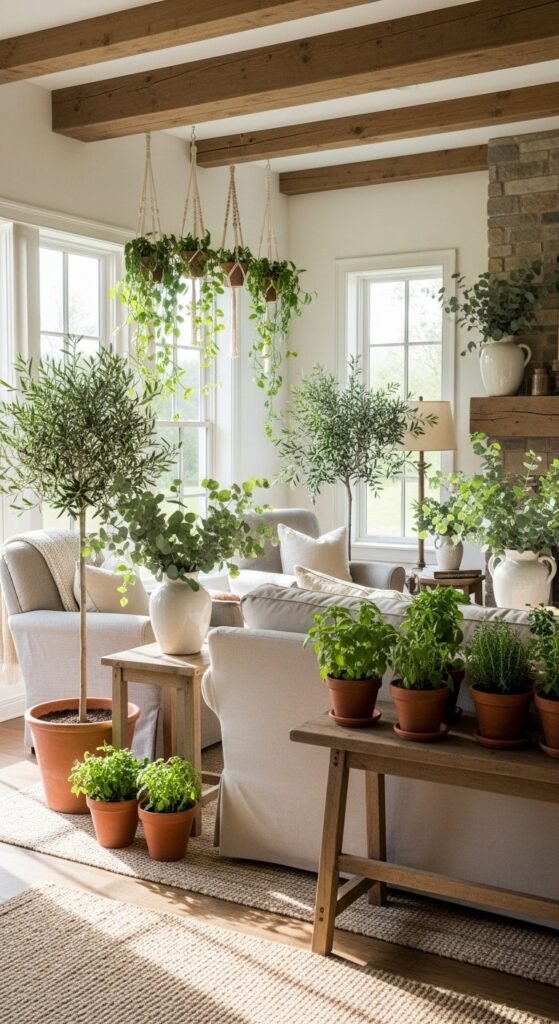 Plants soften farmhouse interiors fast. And they don’t have to be expensive. One tall olive tree instantly fills an empty corner. Faux works if the quality is good.