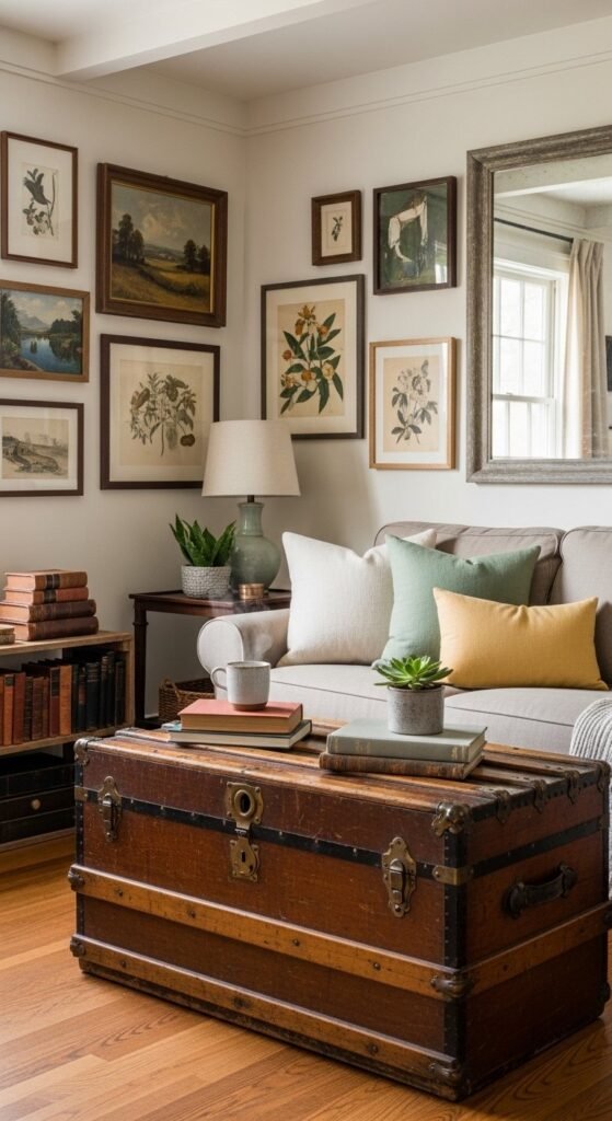 Use one thrifted item as an anchor. A trunk can replace a coffee table and hide blankets. Old crates stack into side tables. Vintage art fills walls without feeling staged.