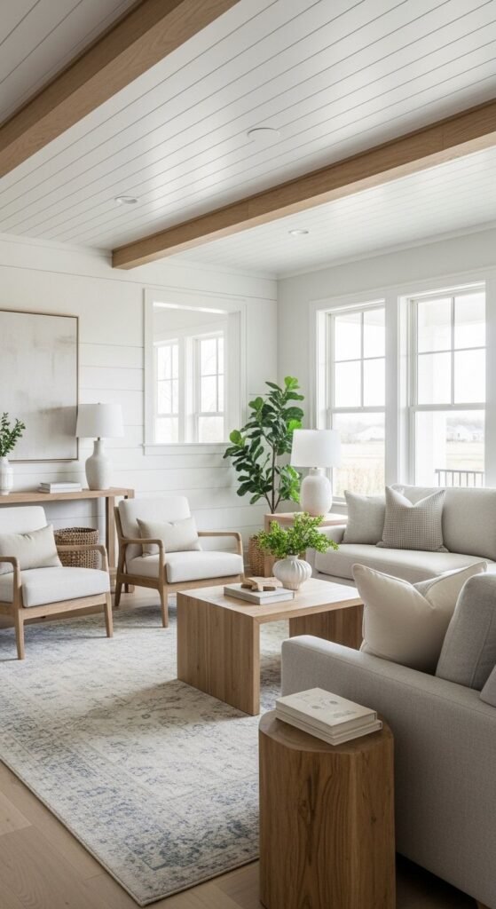 Balance shiplap with smooth surfaces nearby. Upholstery. Plain walls. Simple rugs. Restraint keeps classic details feeling current, especially in open living rooms.
