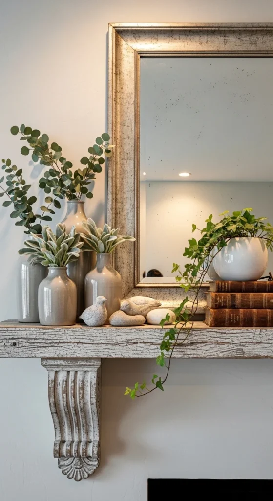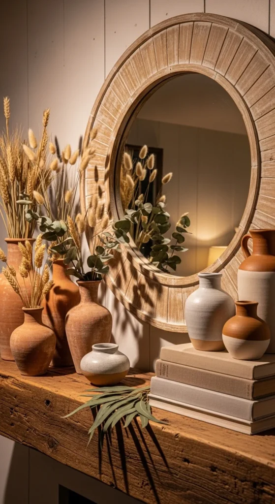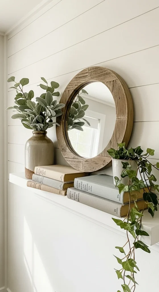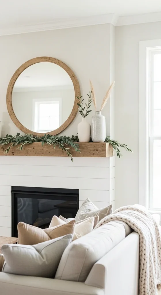 A mirror-centered mantel is a go-to for a reason. It feels calm. It feels balanced. It also works year-round. Start with a round or arched wood mirror as your anchor. Keep the frame warm and slightly weathered. Layer a small stack of neutral books in front. Add a ceramic vase with soft greenery off to one side. Finish with a pair of slim candle holders or a lantern.