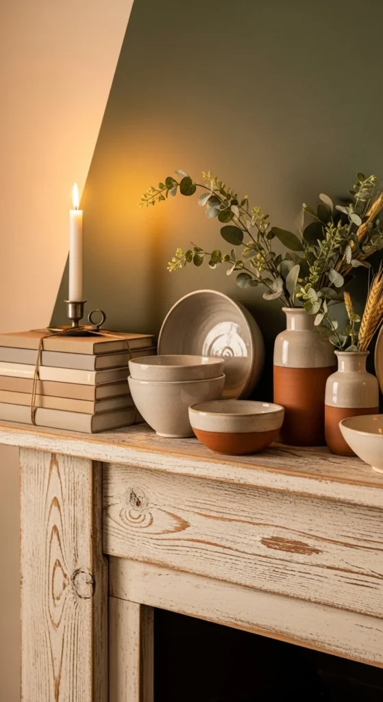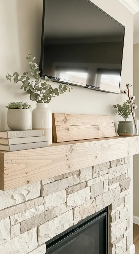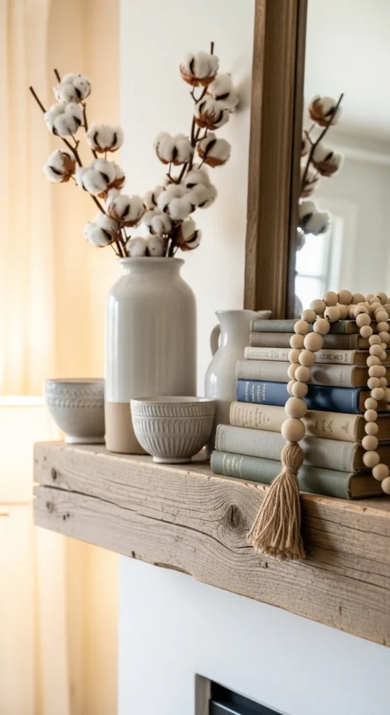 Stick to whites, creams, and soft wood tones. This keeps everything light and relaxed. If your mantel is narrow, choose fewer pieces and space them out. Negative space matters here.