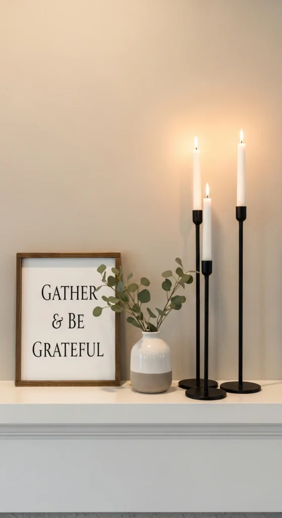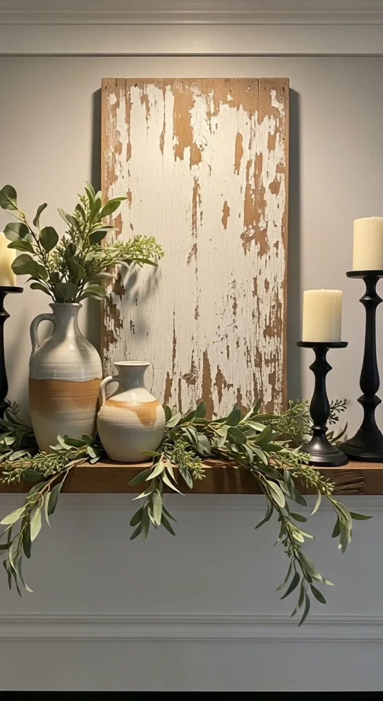 Short on time? This three-piece layout works every time. Center a large wood sign. Place tall candle holders on each side. Add a small greenery accent slightly off-center.