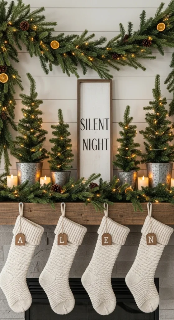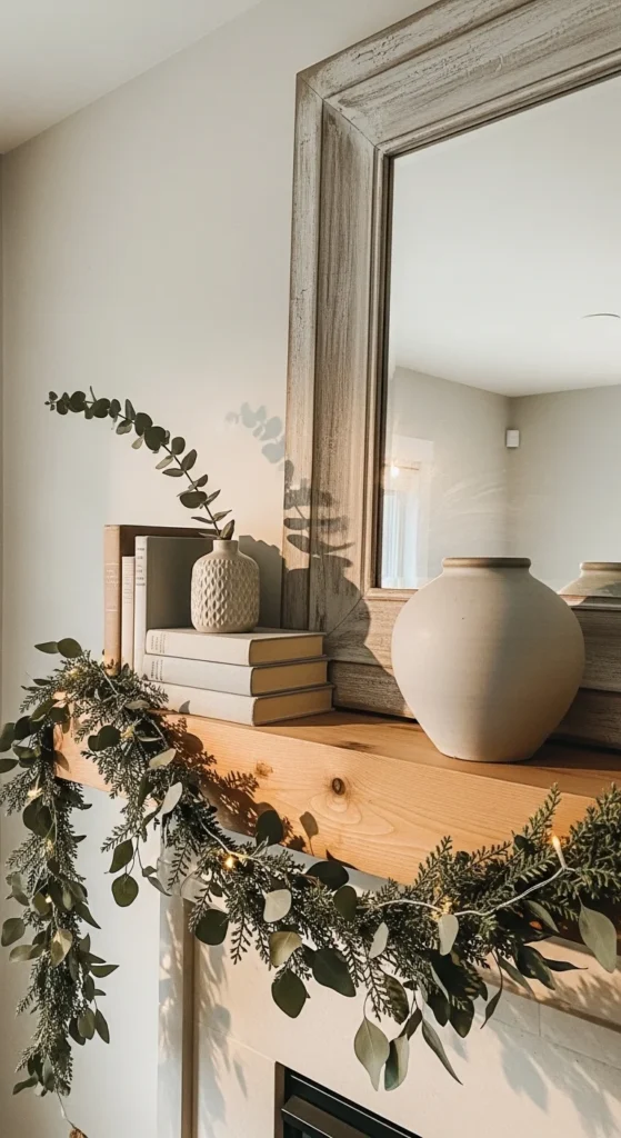 Garlands instantly soften hard lines. Drape greenery across the front edge of the mantel. Let it dip slightly in the center.
