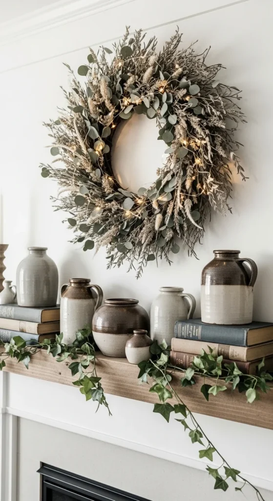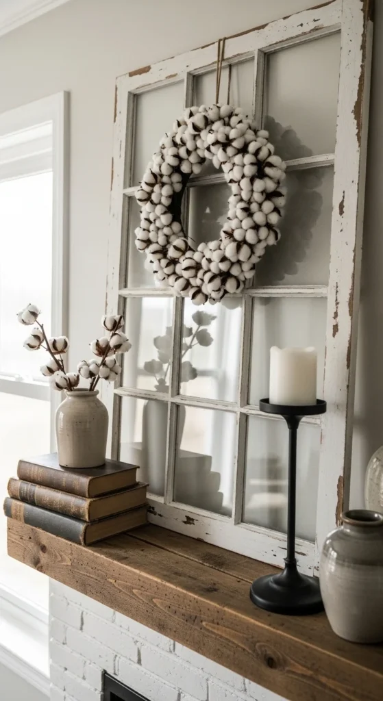 Hang a cotton or boxwood wreath directly on the window frame for depth. Place a small pottery piece in front. Add stacked books horizontally to ground the look. Keep colors muted. Creams. Weathered wood. Soft greens.
