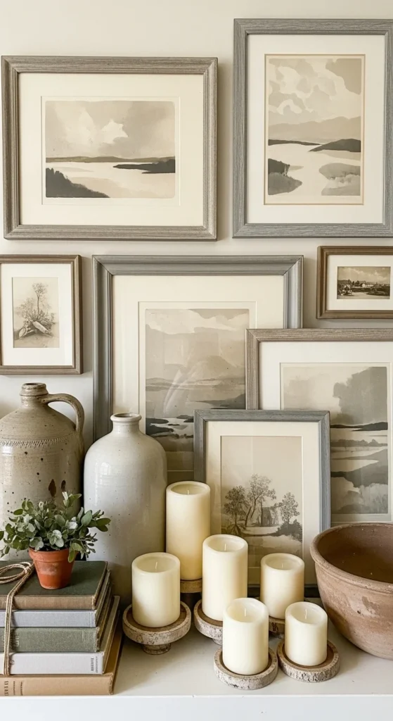Fill frames with black-and-white photos, botanical prints, or simple line art.