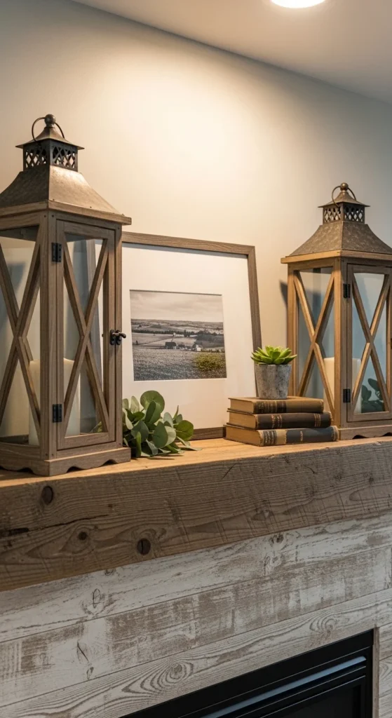 Lanterns bring height and warmth in one step. Place two lanterns of slightly different heights on one side of the mantel. Balance them with a framed photo or small art piece on the other side.