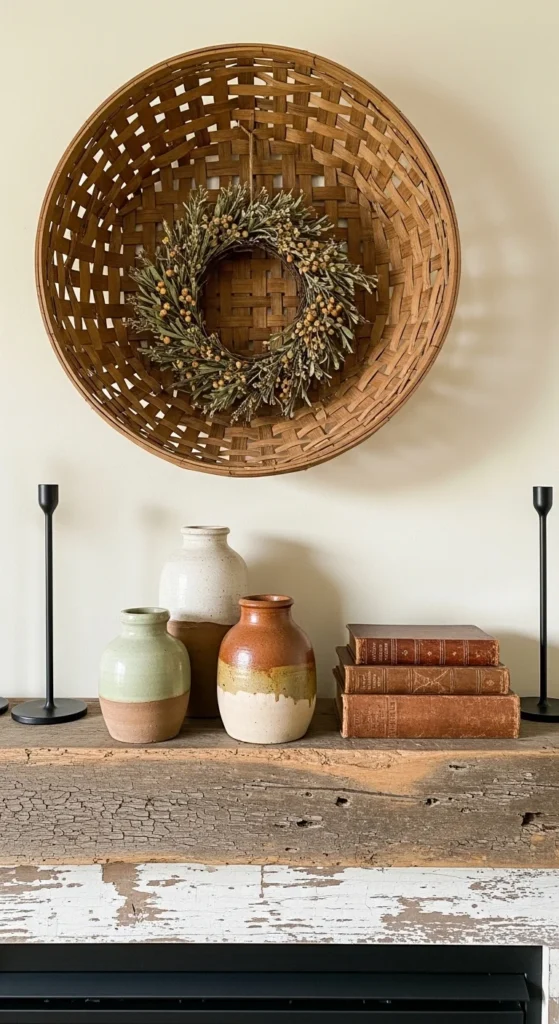 Keep the mantel surface simple. A couple of pottery vases. One short stack of books. Maybe a small candle holder. Let the basket do the heavy lifting.