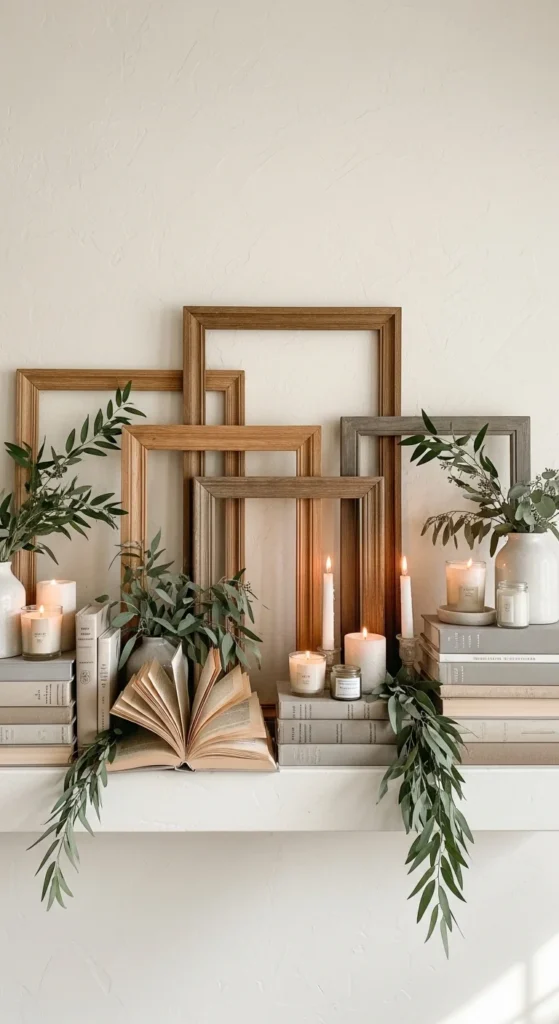 This setup works well for long mantels. The wide frame visually anchors the space. From there, you only need a few supporting pieces.
