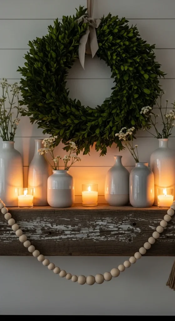 A boxwood wreath reads classic farmhouse. Hang it centered. Let it float slightly above the mantel shelf.