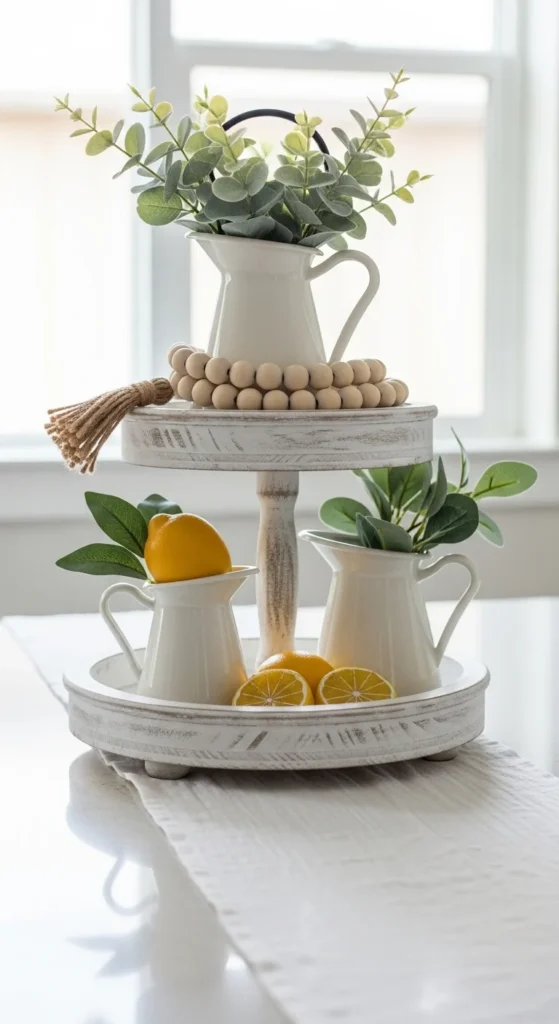 This tray style works because it stays simple and controlled. Lemons bring color, but the rest of the tray stays quiet. Start with white ceramics as your anchor pieces. Small pitchers, bowls, or creamers work well. Place heavier items on the bottom tier to keep the tray stable. Use faux lemons instead of real ones. They last longer and keep their color. Stick to three lemons on the top tier and four or five on the bottom. Odd numbers look more natural and prevent the tray from feeling stiff. Wood beads soften the look and break up the smooth ceramic surfaces. Drape them slightly over the edge for movement. Greenery should feel light, not dense. One or two eucalyptus stems are enough. Avoid dark greens here. This tray suits kitchens, coffee bars, or open shelving. For budget options, dollar-store lemons and thrifted white mugs work just fine. If the tray starts to feel busy, remove one item instead of adding another. Seasonal changes are easy. Swap lemons for oranges in late summer or mini apples in early fall. Keep the base items the same so storage stays manageable. This setup photographs well for Pinterest because the colors stay clean and bright. It also works in small kitchens where bold decor would feel overwhelming.