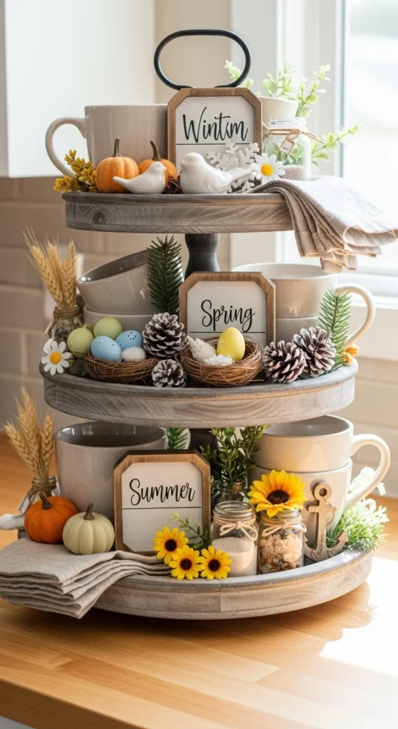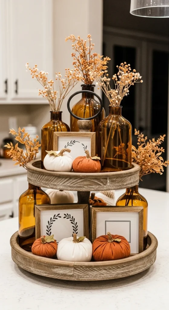 This tray is built for easy changes. Start with neutral base items like white bowls, wood blocks, and simple greenery. These stay year-round. Seasonal pieces are small and easy to store. The base never changes. In fall, add mini pumpkins. In winter, add pine sprigs. In spring, add florals. In summer, add fruit or shells. Keep seasonal items limited to two or three pieces. Too many swaps defeat the purpose. Budget options work well because accents are small. This tray suits busy households or small spaces. It also prevents decor burnout since changes feel quick. If the tray looks uneven, move items between tiers instead of adding more. This approach saves time and storage space. It also keeps your home feeling updated without constant shopping.
