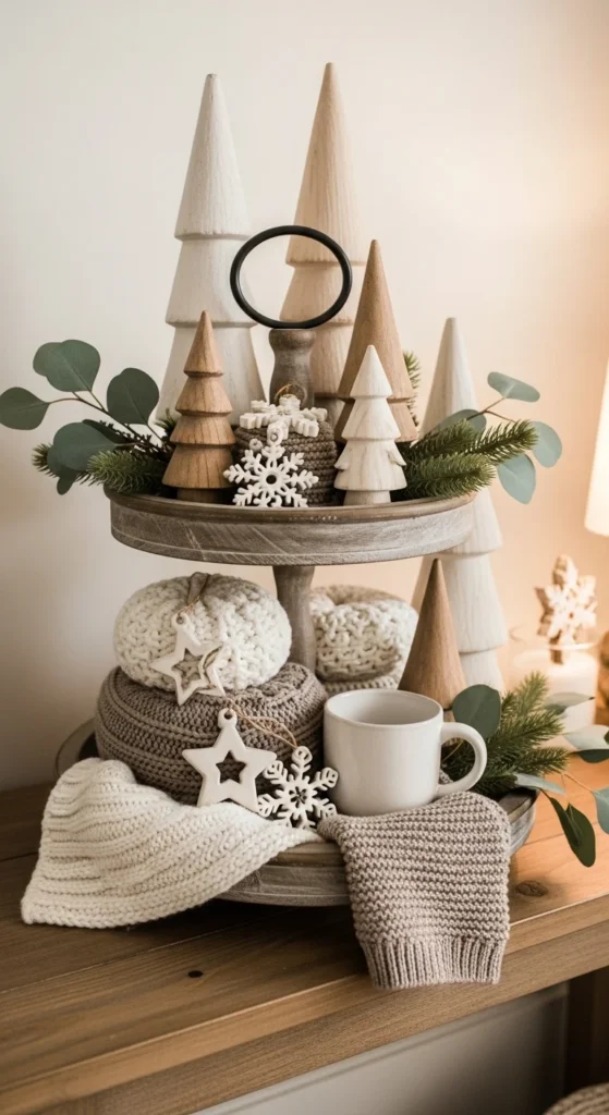 This winter tray stays calm and cozy without heavy themes. Start with neutral knit pieces like small fabric balls or folded swatches. Texture replaces color here. Place heavier wood items on the bottom tier to keep the tray grounded. Wood trees or blocks add height without feeling seasonal-only. Soft texture carries the mood instead of bold objects. Ceramic accents keep the tray from feeling too rustic. Use matte finishes rather than shiny ones. Greenery should feel subtle. Pine sprigs or eucalyptus stems work well. Avoid glitter or metallics if you want a relaxed look. For budget options, cut old sweaters into small pieces and roll them into soft filler shapes. Thrifted wood decor can be sanded for a lighter finish. This tray fits living rooms, entry consoles, or dining sideboards. After winter, remove knit items and keep the wood pieces for year-round use. The base stays useful beyond the season. If the tray feels crowded, remove one small object instead of rearranging everything. This setup works well in homes that lean neutral year-round. It also photographs nicely because textures create depth without relying on contrast.